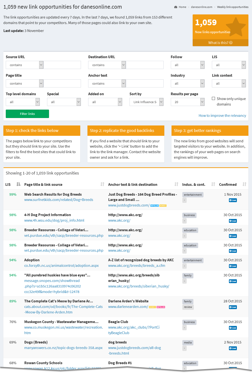 The opportunities are based on the websites that are listed in the competitor watchlist on the project overview page. The closer these websites are related to your own website, the better the link opportunities.